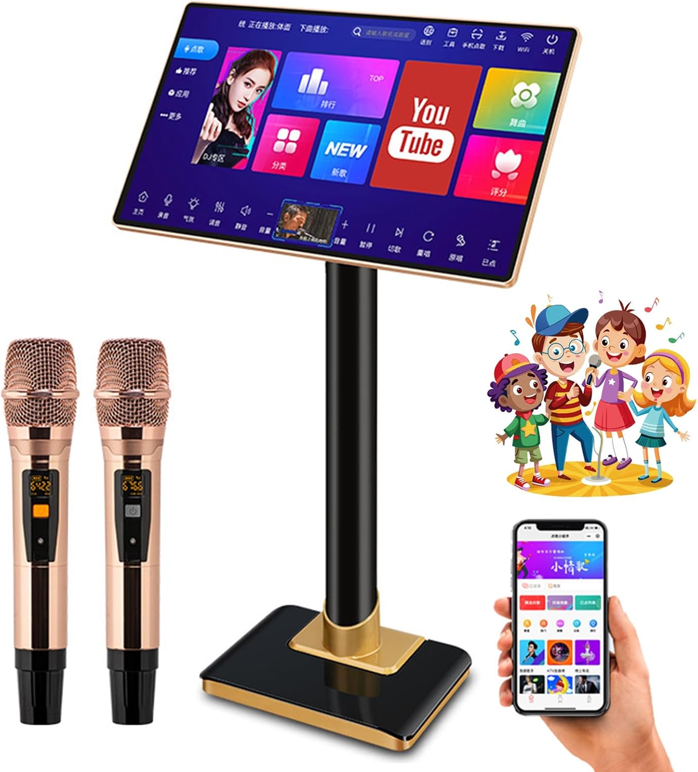 Máquina De Karaoke Profesional De 21,5 Pulgadas, Pantalla Táctil Capacitiva, Micrófono Inalámbrico, Control por Aplicación Y Amplificador De Potencia. Compatible con Varios Idiomas. 3T